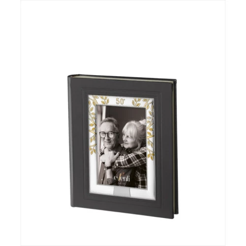 Álbum 50 aniversario de boda en polipiel de calidad con marco de plata bilaminada con alianzas en dorado y árbol de lavida. Álbum donde guardar las fotografías que conmemoran los 50 años de casado. El álbum trae 30 páginas. Entre hojas papel fino transparente de estraza para el cuidado de sus fotografías. Fotografía del frontal de 13x18 cm y 2 fotografías de 13x18 cm por hoja o una grande. posibilidad de grabarlo, personalizarlo. Grabación incluida en el precio. Medida del álbum 24x30cm.