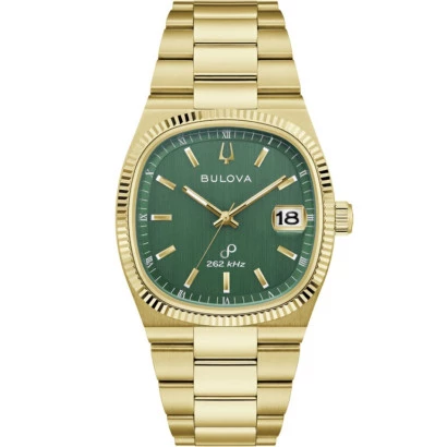 97B237 Reloj Bulova Precisionist SUPER SEVILLE para hombre. Acero 316L, caja de acero cuadrado 37,5, 42,5 milímetros con bisel troquelado con corona de cambio de hora en la posición de las tres, brazalete en acero dorado sólido con cierre desplegable tres piezas con doble pulsador oculto. Esfera en verde con índices y agujas con luminiscente doradas. Calendario, día del mes en la posición de las tres. Grueso de 10,3 mm y peso de 143 gramos. Cristal de zafiro con lupa en calendario. Maquinaria cuarzo pila MN50-YAT, Precisonist con resonador torsional de 3 puntas, segundero barrido continuo y frecuencia 262 kHz con 16 jewels, " 8 veces mayor que el cuarzo estandar", alta precisión, made in Japan. Resistente al agua 30 metros. Estuche y garantía oficial Bulova.