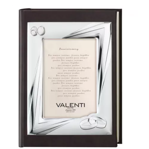 Álbum bodas de 60 aniversario en polipiel en marrón de calidad con marco porta fotos donde poner fotografía más importante del día tan señalado, de plata bilaminada con estampado con alianzas y el 60 en color platino. Álbum conmemorativo donde guardar las fotografías de los 60 años de casados. El álbum trae 30 páginas. Entre hojas papel fino transparente de estraza para el cuidado de sus fotografías. Fotografías de 13x18 cm por hoja o una grande. Posibilidad de personalizarlo, grabarlo. grabación incluida en el precio. Medida del álbum 25x30cm.