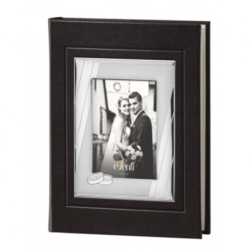 Álbum para boda en polipiel de calidad con marco de plata bilaminada con alianzas de boda de recién casados. Álbum donde guardar las fotografías de ese día tan importante. El álbum trae 30 páginas. Entre hojas papel fino transparente de estraza para el cuidado de sus fotografías. Fotografía del frontal de 13x18 cm y 2 fotografías de 13x18 cm por hoja o una grande. posibilidad de grabarlo, personalizarlo. Grabación incluida en el precio. Medida del álbum 24x30cm.