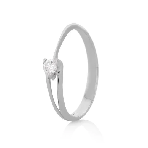 Anillo solitario joya en oro blanco 750 milésimas con diamante talla brillante 0,09 kilates engarzado en una garra en tres puntos brazo abierto en una parte saliendo la garra, ideal regalo de pedida