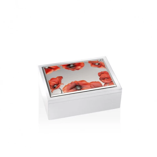 Caja para joyas y relojes en madera blanca. Acabado chapa bilaminada en plata aleación de metales con flores amapolas, posibilidad de grabado personalizado. Medidas 13X18 cm