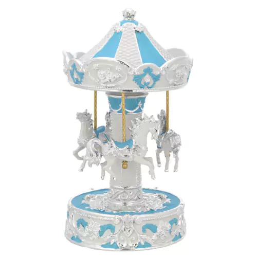 Carrousel musical con caballos de cerámica, en azul celeste plateados para bebé niño. Se le da cuerda girando hacia el sentido de las agujas del reloj y al soltar gira y suena una bonita música hasta terminar cuerda.
