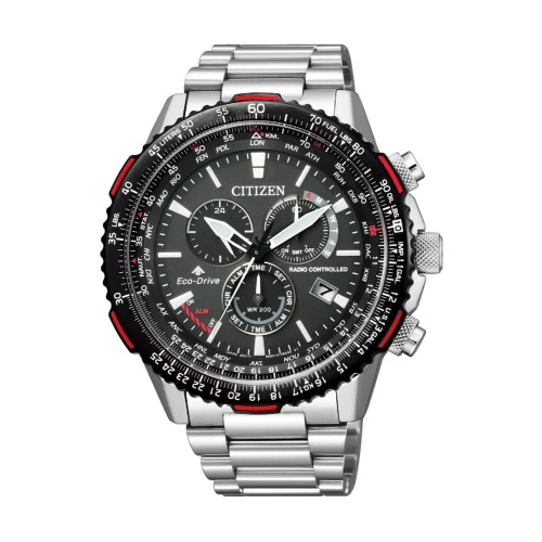cb5001-57e reloj Citizen radiocontrolado para hombre con caja y brazalete de acero, cristal zafiro, crono, alarma y EcoDrive (se carga con luz), estuche y garantía Citizen.