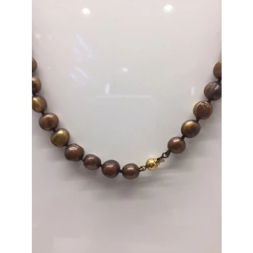 Joya collar de perlas en marrón medida de las perlas 9 milímetros, trae cierre redondo en oro amarillo18 kilates con lengueta de seguridad, medida 45 cm.