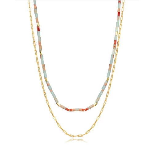 Viceroy collar 13041c100-99 colección Elegant para mujer en plata bañada en oro, dos cadenas una eslabones sencillos largos y otra con piedras agalmatolite formada por la alteración hidrotermal de la roca riolita de colores azules rojos. Medida 40 + 45 cm + 3 cm. Collar con cierre tipo mosquetón de seguridad Viceroy. Trae estuche y garantía Viceroy