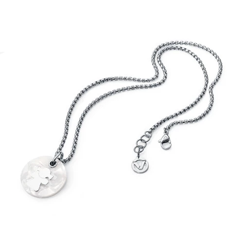 Collar de Viceroy 2242c09000 con cadena de eslabones en acero, de 45 centímetros, con el detalle del logo Viceroy en el extremo de la cadena y con cierre de seguridad tipo mosquetón. Trae colgante en redondo de 2 centímetros y medio de acetato tipo marfil, con detalle de niña en acero en la parte central, collar divertido.