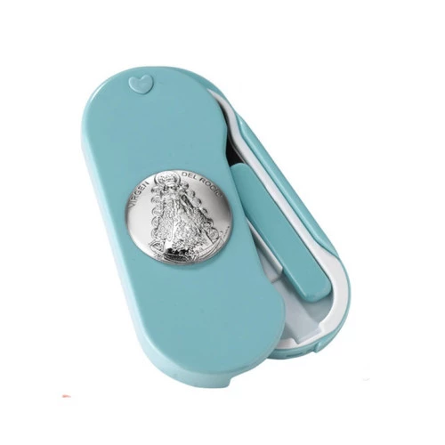 Set de cubiertos de viaje cuchara, tenedor para bebe en estuche de plástico, con figura Virgen del Rocio, cómodo transportar y limpio medidas de 7x18 centímetros disponible en rosa y azul