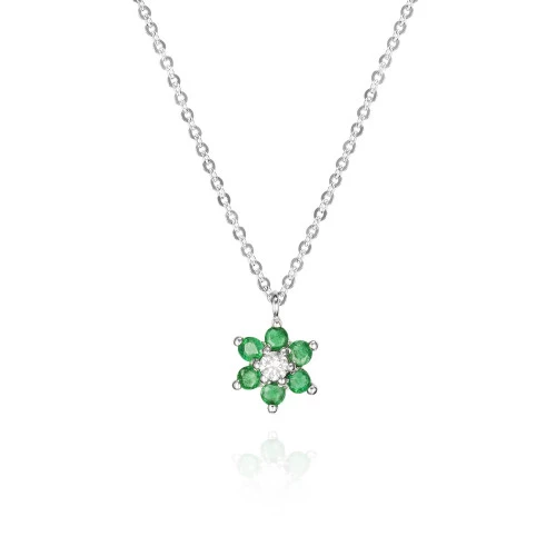 Collar en oro blanco de 750 milésimas 18k con colgante tipo roseta con 6 esmeraldas naturales de 0,24ct talla brillante engarzados y garra con diamante central, talla brillante con 0,05 ct, con acabado fino y elegante. Con certificado de autenticidad y calidad. De la firma Gayubo.