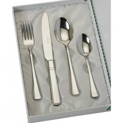 Set de cubiertos cadete ga4007. Cuchara, cuchillo, tenedor, cucharilla de café con mango plano, fácil limpieza lavavajillas. Cuchara de 18 cm, cuchillo de 18 cm, tenedor 18 cm, cuchara y tenedor pequeños de 15 cm. Trae estuche. Posibilidad de grabarlo