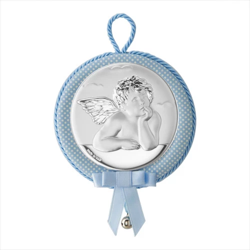 Medallón musical para la cuna del bebé en azul con topos con Ángel de la guarda bilaminada al apretar el medallón toca canción de cuna. 11 centímetros de diámetro. EV5124/02C