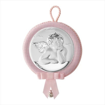 Medallón musical para la cuna del bebé en rosa con topos con Ángel de la guarda bilaminada al apretar el medallón toca canción de cuna. 11 centímetros de diámetro. EV5124/02R