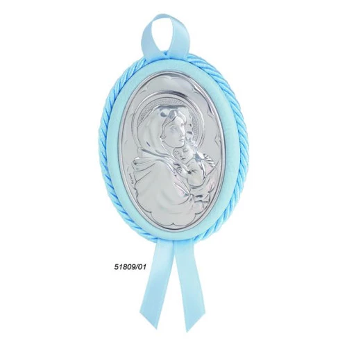 Medallón musical para la cuna del bebé en azul celeste con la virgen y el niño en plata bilaminada al apretar el medallón toca canción de cuna. Medida del medallón 12 cm x 9 cm. 51809-1