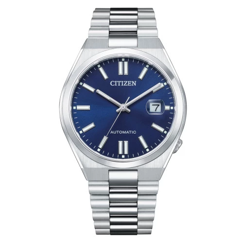 Reloj Citizen NJ0150-81L Tsuyosa automático con calibre 8210 recarga automática 21600 oscilaciones por hora. 21 rubíes. 40 horas de reserva de marcha, estando al 100%. Movimiento con pesos oscilantes en lugar de rotores circulares con engranajes. Caja y brazalete de acero con cierre doble de seguridad. Corona cambio de hora en la posición de las cuatro. Esfera en azul con calendario en la posición de las tres día del mes con lupa. Cristal de zafiro irrayable. Agujas en plateado finas y elegantes luminiscentes. Medida de 40 milímetros, grueso de 11,7 milímetros y peso de 138 gramos. Fondo cerrado a rosca donde se aprecia movimiento. Resistente agua 5 bar. Estuche y garantía Citizen. Coleccíon Crystal seven relojes automáticos, llamados así por el material con el que se creo el cristal. Respetando los rasgos básicos del original 1965. Todo un reloj vintage.