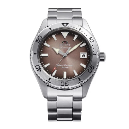 Reloj Orient Mako RA-AC0Q17Y30B. Reloj mecánico calibre F6724, made in japan, automático, autocarga y carga manual, se le puede dar cuerda, 21 rubíes, 21,600 vibraciones hora. Detención de segundero. Caja y brazalete de acero, bisel giratorio unidireccional en plateado. Esfera en color cobre degradado con índices y agujas luminiscentes, aguja del segundero con punta de flecha en rojo, calendario en la posición de las tres. Cristal de zafiro irrayable. Tapa y corona cerradas a rosca. Garantiza hermetismo, 200 metros. Diámetro de caja de 39,9 milímetros y grosor de caja de 12,8 milímetros. Estuche y garantía oficial Orient. Grupo Epson Seiko