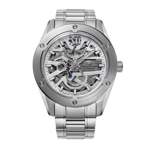 Orient Star Avant-garde Skeleton RE-BZ0001S00B mecanismo automático mecánico. Semi skeleton. Movimiento mecánico: Orient calibre F8F64. Relojería Made in Japan. 21 rubíes. 21,600 vibraciones hora. Reloj con reserva de marcha de 60 horas, mecanismo de detención de segundero. Reloj automático con caja y brazalete de acero macizo, esfera en gris. Agujas e índices luminiscentes. En esfera indicador de reserva de carga a las doce. Esfera segundos a las seis y ventana en las nueve y dos donde se aprecia mecanismo. Tapa acristalada cerrada a rosca. Cristal de zafiro irrayable El tratamiento super anti-reflejo (SAR) del cristal de zafiro evita la refulgencia de la luz en un 99% y asegura que cada faceta del diseño será claramente apreciada. Orient con medida de caja de 42,3 milímetros y grueso de 12,4 milímetros. Resistente al agua 100 metros Trae estuche y garantía oficial Orient Star.