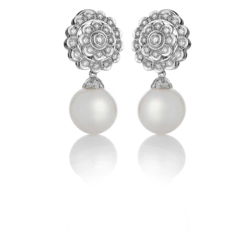 Pendientes rosetón con perla australiana en oro blanco 750 milésimas con diamantes talla brillante 1,95 ct, con tuerca cierre de seguridad, regalo ideal