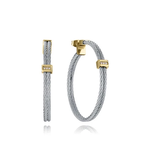 Pendientes en acero dos titar trenzadas con acero ip dorado con circonitas para mujer con un tamaño de 4,5 cm.