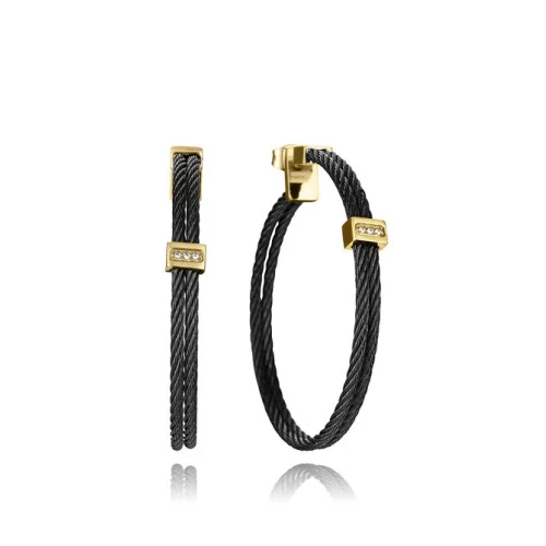 Pendientes en acero ip negro dos titar trenzadas con acero ip dorado con circonitas para mujer con un tamaño de 4,5 cm.
