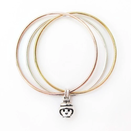 Pulsera de Playmobil 7001b000 con cara de chica con medida de 10 milímetros que cuelga en tres brazaletes unidos de 6 centímetros de diámetro, bañados en plata, oro.rosa y oro amarillo