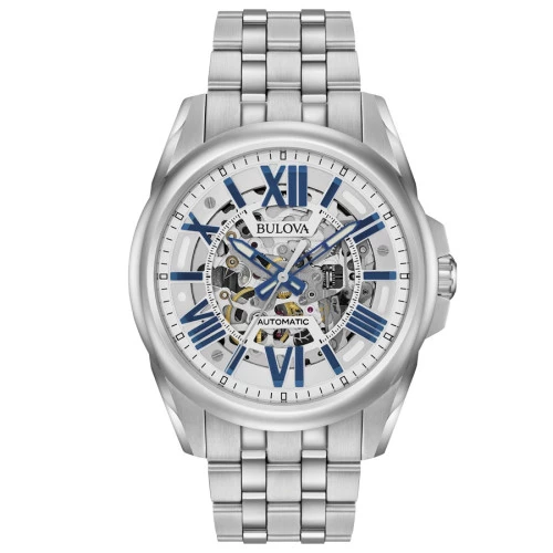 Reloj Bulova 96A187 Sutton Skeleton para hombre automático, 43 mm acero, esfera blanca y agujas azules, 8n26, garantía Bulova.