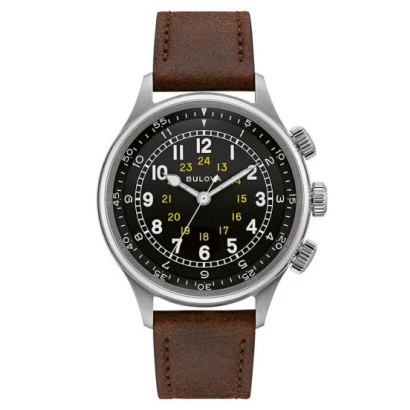 Reloj Bulova 96A245 hombre colección Military inspirado en el reloj Military Issue. Caja de acero con correa de piel marrón. 42 milímetros de diámetro, grueso de 14 milímetros. Esfera en negro con discos internos giratorios operados con las dos coronas, la corona en la posición de las 2 gira indicando el tiempo transcurrido y la corona en la posición de las 4 indica la hora dual. Cristal de zafiro con tratamiento antirreflectante. Automático, 21600 alternancias por hora, 6 golpes por segundo, 21 rubíes. Con capacidad de cuerda manual y reserva de marcha de 42 horas aproximadamente. Resistente al agua 30 metros. Estuche y garantía oficial Bulova.