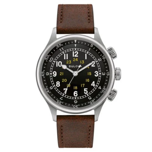 Reloj Bulova 96A245 hombre colección Military inspirado en el reloj Military Issue. Caja de acero con correa de piel marrón. 42 milímetros de diámetro, grueso de 14 milímetros. Esfera en negro con discos internos giratorios operados con las dos coronas, la corona en la posición de las 2 gira indicando el tiempo transcurrido y la corona en la posición de las 4 indica la hora dual. Cristal de zafiro con tratamiento antirreflectante. Automático, 21600 alternancias por hora, 6 golpes por segundo, 21 rubíes. Con capacidad de cuerda manual y reserva de marcha de 42 horas aproximadamente. Resistente al agua 30 metros. Estuche y garantía oficial Bulova.