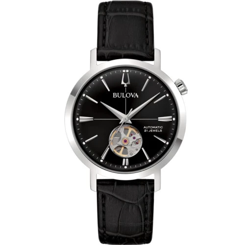 96A317 Reloj Bulova Aerojet en acero y piel automático, esfera en negro, garantía Bulova.