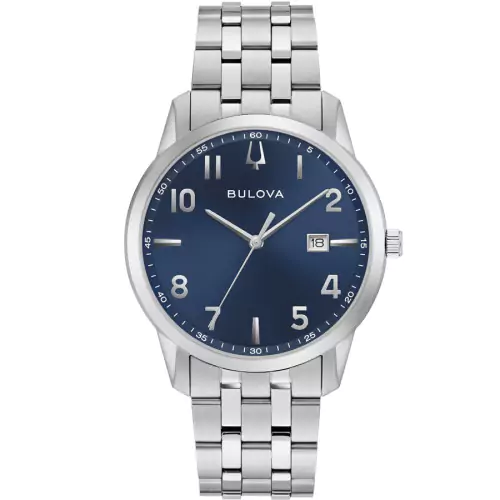 Reloj Bulova 96B475 para hombre colección Sutton Slim. Caja y brazalete de acero 316L con 40 milímetros de diámetro, grueso de 7,3 milímetros, peso de 117 gramos. Esfera azul con índices números arábigos y calendario en la posición de las tres. Cristal mineral resistente. Made in Japan. Movimiento cuarzo 9U13-00V. Resistente al agua 3 bares. Estuche y garantía oficial Bulova.