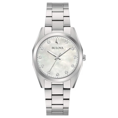 Reloj Bulova 96p228 para mujer de cuarzo, 31 mm acero, esfera madreperla con diamantes agujas plateadas, garantía Bulova.