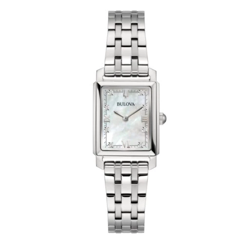 Reloj Bulova 96P244 rectangular para mujer con diamantes colección Sutton Lady de cuarzo. Caja de acero 316L con 32,5 milímetros con corona de cambio de hora en la posición de las tres, grueso de 6,9 milímetros, peso de 93 gramos con brazalete en acero sólido con cierre oculto desplegable con doble pulsador. Esfera madreperlas con Índices ocho diamantes elegantes. Cristal mineral endurecido. Maquinaria miyota de cuarzo pila, GL22-10A, made in Japan. Resistente al agua 30 metros. Estuche y garantía oficial Bulova.