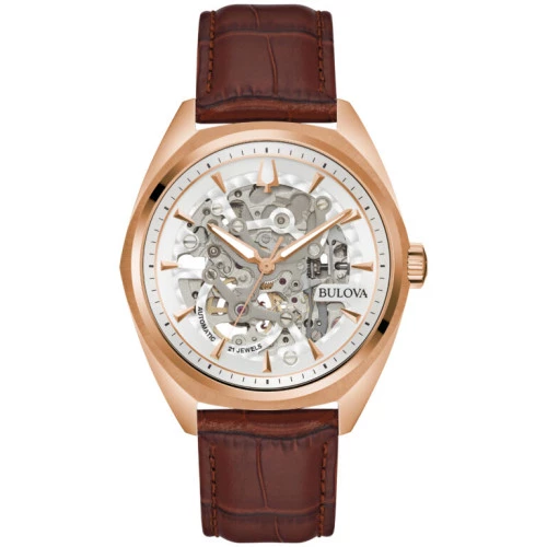 Reloj Bulova 97a175 para hombre automático esqueleto, 41 mm acero dorado rosa y piel, Miyota, garantía Bulova.