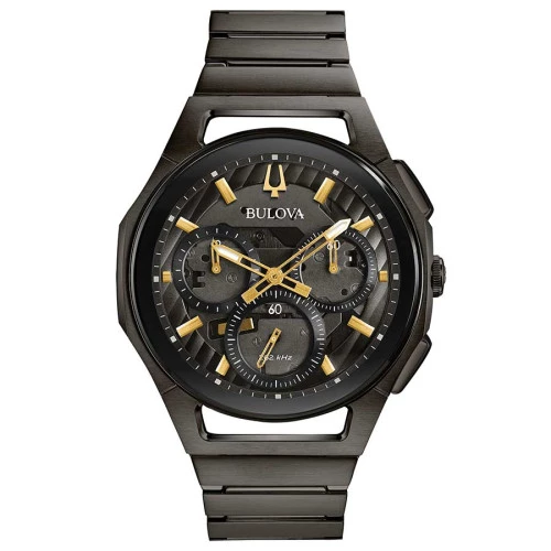 Reloj Bulova 98a206 para hombre colección Curv progressive curva progresiva. Caja de acero negro con 44 milímetros de diámetro, botones del cronógrafo y corona de cambio de hora en la posición de las tres. Brazalete sale de la caja con línea estilizada en acero sólido en ip negro con cierre desplegable con doble pulsador. Esfera negra transparente con negro que resaltan las esferas del cronógrafo con índices y agujas con luminiscente en dorado. Grueso de 10 mm y peso de 150 gramos. Cristal curvo de zafiro. Tapa transparente cerrada con tornillos donde se aprecia calibre Bulova nr20 cuarzo pila cronógrafo que presenta un cristal de cuarzo de 3 puntas con una frecuencia de 262 kHz que es 8 veces mayor que el cuarzo estándar, lo que lleva a una precisión de segundos al año, made in Japan. Resistente al agua 30 metros. Estuche y garantía oficial Bulova.