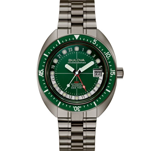 Reloj Bulova 98B415 GMT black negro para hombre colección oceanographer Oceanógrafo. Devil Diver icono de 1970. Nueva versión diseño prácticamente igual al de los 70. Caja de acero 316L con bisel externo en rojo y azul, bisel unidireccional 60 clicks. 41 milímetros de diámetro con corona de cambio de hora en la posición de las tres, grueso de 15 milímetros, peso de 160 gramos y brazalete de acero sólido con cierre desplegable con doble pulsador Bulova. Esfera en color verde con calendario en la posición de las tres. Índices y agujas con luminiscente y aguja del GMT en rojo. Cristal zafiro bombé antirreflejo. Tapa cerrada a rosca, made in Japan. Movimiento automático 9075 con 28800 alternancias por hora, 24 rubíes. Con capacidad de cuerda manual y reserva de marcha de 42 horas aproximadamente. Resistente al agua 20 bares. ISO. 666 feet. Estuche y garantía oficial Bulova.