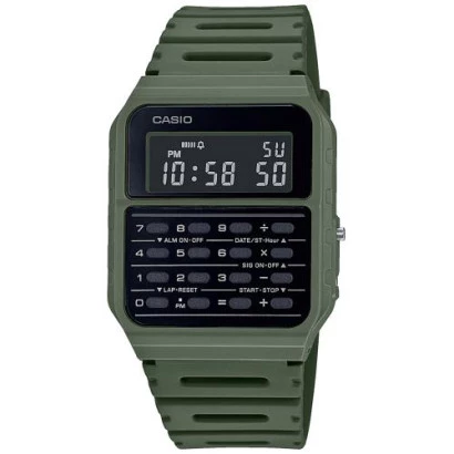 Reloj Casio calculadora ca-53wf-3bef unisex en verde caja y correa de resina, esfera y botones en negro. Calculadora operaciones simples de 8 dígitos se puede sumar, restar, multiplicar y dividir. Segunda zona horaria. Cronómetro - 1/100 seg. - 24 horas, medición preciso de tiempo transcurrido con el toque de un botón. Alarma diaria que emite una señal acústica en el momento programado. Calendario automático una vez programado muestra siempre la fecha correcta. Posibilidad de formato de horas AM PM 12 o 24 horas. Duración de la batería pila de 5 años aproximadamente. Resistente al agua según según DIN 8310 o ISO 22810. Medida de caja 43,2 mm x 34,4 mm x 8,2 mm y peso de 25 gramos. Garantía y estuche Casio
