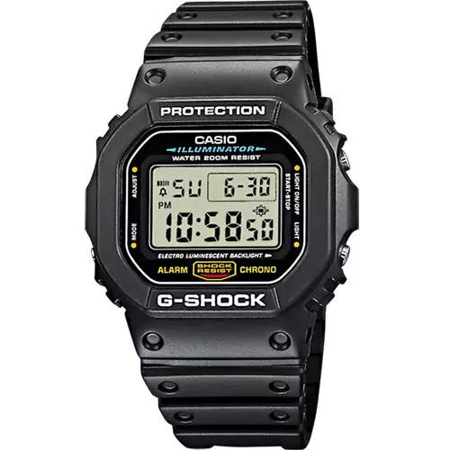 Reloj Casio dw-5600e-1ver G-SHOCK. Caja y correa de resina y con cierre de hebilla de seguridad. Digital esfera. Cristal mineral dificil de rayar. Reloj con luz ilumina toda la pantalla. Pantalla destellante cuando llega a una alarma. Cronómetro 1/100 segundos, mide tiempos parciales y tiempo final; capacidad de cronometrar hasta una hora. Temporizador con cuenta atrás con señal acustica en el momento programado. Se pueden configurar por segundos o hasta con 1 hora de antelación, para recordar entrenamoentos a intervalos o para toma de medicamentos. Alarma multiple diarias independientes. La señal horaria ocasiona que el reloj emita zumbidos a cada hora. Calendario automático muestra siempre la fecha correcta. Hora pm/am 12 24 horas. Vida util de la pila de 2 años aproximadamente. Medidas de 48,9 mm x 42,8 mm x 13,4 mm y peso de 53 gramos. Resistente al agua 200 metros, 20 bares (ISO 22810). Estuche y garantía Casio.