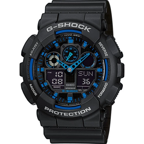 Reloj Casio G-SHOCK ga-100-1a2er. Caja y correa de resina sintética,con extrema resistencia y flexibilidad, cristal mineral endurecido difícil de rayar. Medidas de 55 milímetros X 51,2 milímetros y 17 milímetros de grueso y con un peso de 70 gramos. Con duración de pila de unos dos años. Resistente al agua 200 metros. Esta indicación en metros no se refiere a la profundidad de inmersión, sino a la presión del aire que se ha utilizado en la prueba de resistencia al agua. (ISO 22810). Resistente a los golpes pues la carcasa es resistente a los golpes y protege contra impactos y vibraciones. Luz LED automática, simplemente con girar ligeramente la muñeca para que se ilumine la pantalla del reloj con un LED. Calendario automático. Las horas se visualizan ya sea en el formato de 12 o 24 horas. Antimagnético, la caja está construida de tal forma, que el mecanismo del reloj queda protegido de campos magnéticos lo cual no produce ningún error en el funcionamiento del Casio. Cronómetro de 100 horas, tiempo recorrido, tiempo fraccionado y tiempo final con una exactitud de una milésima de segundo. Temporizadores - 1/1 minuto - 24 horas (con repetición automática), los temporizadores con cuenta atrás son de gran utilidad a la hora de recordar, emiten una señal acústica en el momento programado, practico para el aviso diario. 5 alarmas con aviso con una señal acustica, y alarma con snooze se apaga y vuelve a sonar después de unos minutos. Horario mundial hasta 29 zonas horarias distintas. Indicador de velocidad , taquímetro, sólo tiene que introducir la distancia al principio y luego pulsar el cronómetro, tanto al comienzo como al llegar al destino, para que se muestre así la velocidad media. Trae estuche y garantía Casio.