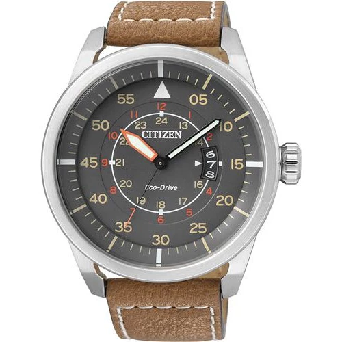 Reloj Citizen AW1360-12H eco drive para hombre colección Aviator en esfera negra y correa de piel marrón, estuche y garantía Citizen