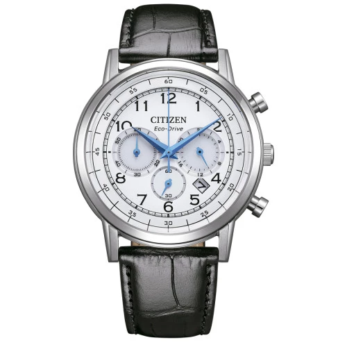 Reloj Citizen CA4630-02A crono para hombre. Movimiento eco drive b620. Reloj Eco Drive con carga de luz, con reserva de carga de 9 meses. Trae cronógrafo 1/5 segundos a 60 minutos. Calendario y reloj 24 horas. Caja de acero y correa de piel. Calendario en la posición de las cuatro y media. Índices números arábigos y agujas en azul. Fondo cerrado a rosca Impermeable 5 bares. Diámetro de la caja 42 milímetros, grueso de 13,6 milímetros y peso 75 gramos. Garantía Citizen