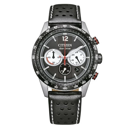 Reloj Citizen CA4717-06E crono para hombre. Movimiento eco drive b620. Reloj Eco Drive con carga de luz, con reserva de carga de 9 meses. Trae cronógrafo 1/5 segundos a 60 minutos. Calendario y reloj 24 horas. Esfera en blanco. Caja de acero ip black y correa de piel racing. Bisel negro con taquímetro. Fondo cerrado a rosca Impermeable 10 bares. Diámetro de la caja 39,5 milímetros, grueso de 12,3 milímetros y peso 68 gramos. Garantía Citizen