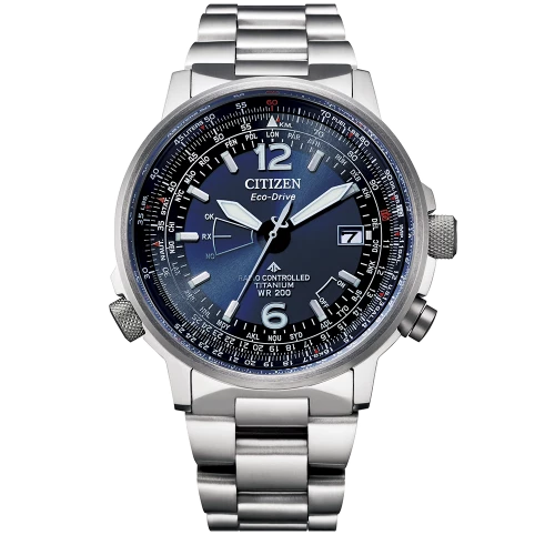 Reloj Citizen cb0230-81l radiocontrolado h145 solar para hombre. Eco-Drive (luz infinita) con una reserva de marcha de 6 meses, 2 años en ahorro de energía con visualización de reserva de carga. Recepción de la señal de EE.UU., Europa, Japón y China. Selección automática de la estación emisora. Horario de verano. Worldtimer con horas de 26 ciudades en el mundo. Calendario perpetuo, hasta 28-8-2100. Caja con diámetro 42,4 milímetros y brazalete de super titanio, esfera en azul, agujas e índices números arabigos luminiscentes, calendario el posición de las tres. Bisel interno giratorio con regla de calculo. Cristal de zafiro. WR 20, 200 metrosl. Garantía oficial y estuche Citizen.
