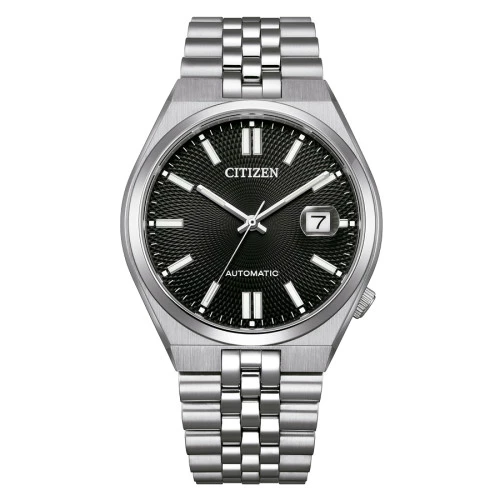 Reloj Citizen NK0020-55E Tsuyosa 60 horas de autonomía automático. Calibre 8310 recarga automática 21600 oscilaciones por hora. 21 rubíes. 60 horas de reserva de marcha, estando al 100%. Movimiento con pesos oscilantes en lugar de rotores circulares con engranajes. Caja y brazalete de acero tipo jubilee con cierre doble de seguridad. Corona cambio de hora en la posición de las cuatro. Esfera en negro degradada con calendario en la posición de las tres, día del mes con lupa. Agujas en plateado finas y elegantes luminiscentes. Cristal de zafiro irrayable. Medida de 40 milímetros, grueso de 11,5 milímetros y peso de 141 gramos. Fondo cerrado a rosca donde se aprecia movimiento, calibre 8210. Resistente agua 5 bar. Estuche y garantía oficial Citizen
