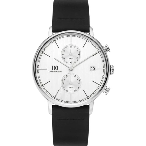 Reloj Danish DesignIQ12Q1290 colección para caballero Tidlos, KOLTUR CHRONO II GREY. Reloj en acero caja y correa en piel negra con habilla de seguridad. Cristal mineral resistente. Esfera en color blanco con agujas e índices en plateado finos y elegantes. Calendario día del mes en la posición de las tres. Diámetro de caja de 42 milímetros y grueso 10,3 milímetros. Resistente al agua 5 bares 50 metros. Maquinaria calibre SEIKO VD51. Estuche y garantía Danish Design