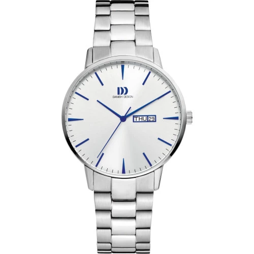 Reloj Danish DesignIQ90Q1267 colección para caballero Tidlos, AKILIA DAY-DATE COBALT LINK. Reloj en acero caja y brazalete con cierre desplegable oculto. Cristal mineral resistente. Esfera en color blanco con agujas e índices en azul finos y elegantes. Reloj maestro. Doble calendario en la posición de las tres. Diámetro de caja de 41 milímetros y grueso 7,2 milímetros. Resistente al agua 3 bares 30 metros. Maquinaria calibre MIYOTA GM00. Estuche y garantía Danish Design