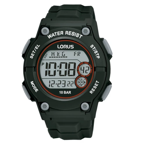 Reloj Lorus R2329PX9 colección Digital. Movimiento Japonés from SEIKO. Caja de resina y correa de poliuretano flexible en negro. Pantalla digital. Timbre, Cronómetro, memoria, luz, alarma, temporizador, calendario automático 2000 a 2049, día , fecha y mes. Horas 12 / 24. El electroluminiscente incorporado (EL) ilumina la pantalla para facilitar la lectura en la oscuridad. Cristal acrílico. WR 10 bar, resistente 100 metros. Tamaño de caja de 38 milímetros. Calibre Z010. Estuche y garantía oficial Lorus