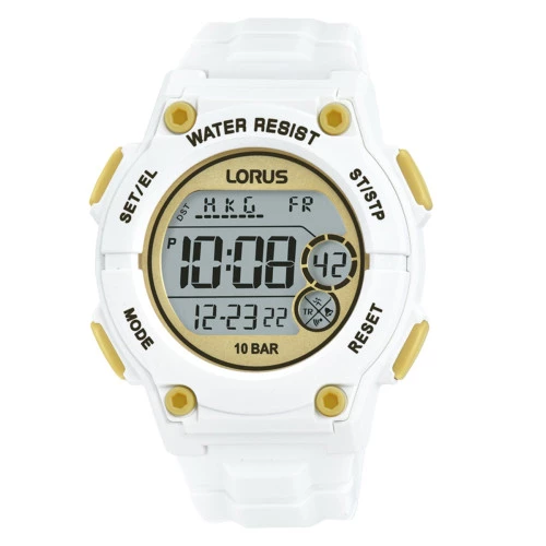 Reloj Lorus R2337PX9 colección Digital. Movimiento Japonés from SEIKO. Caja de resina, correa de poliuretano flexible en blanco, pulsadores amarillos. Pantalla digital. Timbre, Cronómetro, memoria, luz, alarma, temporizador, calendario automático 2000 a 2049, día , fecha y mes. Horas 12 / 24. El electroluminiscente incorporado (EL) ilumina la pantalla para facilitar la lectura en la oscuridad. Cristal acrílico. WR 10 bar, resistente 100 metros. Tamaño de caja de 38 milímetros. Calibre Z010. Estuche y garantía oficial Lorus