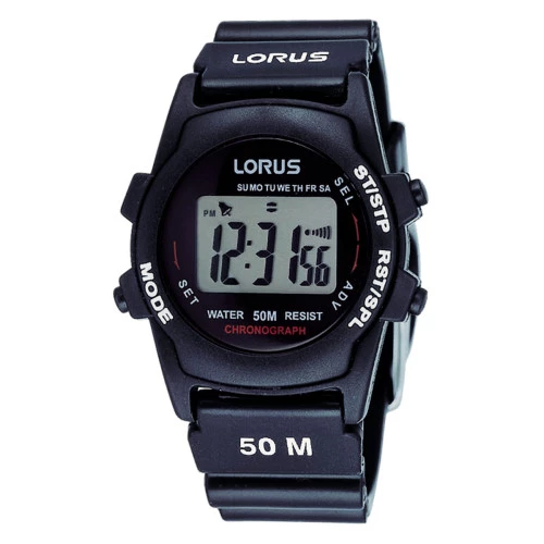 Reloj Lorus R2357AX9 cadete colección Digital. Movimiento Japonés from SEIKO. Caja de resina y correa de poliuretano flexible en negro. Pantalla digital. Cronómetro, luz, alarma, temporizador, calendario automático 2000 a 2049, día , fecha y mes. Horas 12 / 24. Cristal acrílico. Fondo de caja en acero cerrado con tornillos. WR 5 bar, resistente 50 metros. Tamaño de caja de 36 milímetros. Calibre z002. Estuche y garantía oficial Lorus
