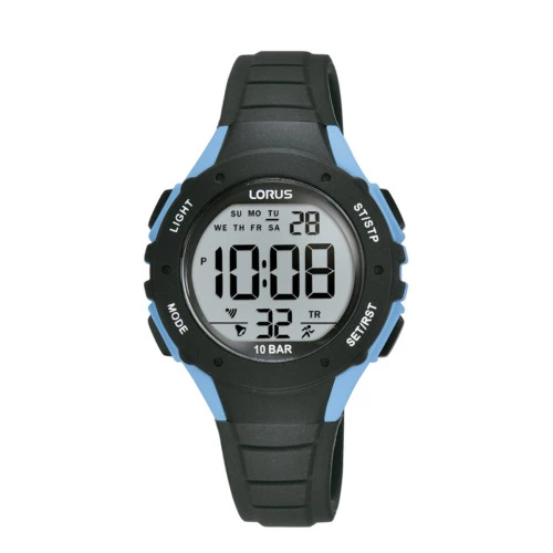 Reloj Lorus R2359PX9 cadete colección Digital. Movimiento Japonés from SEIKO. Caja de resina y correa de poliuretano flexible en negro. Pantalla digital. Cronómetro, luz, alarma, temporizador, calendario automático 2000 a 2049, día , fecha y mes. Horas 12 / 24. Cristal acrílico. Fondo de caja en acero cerrado con tornillos. WR 10 bar, resistente 100 metros. Tamaño de caja de 32 milímetros. Calibre Z013. Estuche y garantía oficial Lorus