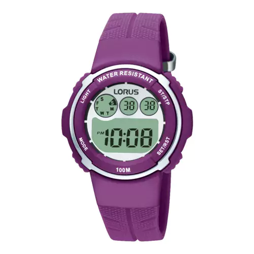 Reloj Lorus R2379DX9 colección Digital. Movimiento Japonés from SEIKO. Caja de resina y correa de silicona flexible en morado. Pantalla digital. Cronómetro, luz, alarma, temporizador, calendario automático 2000 a 2049, día , fecha y mes. Horas 12 / 24. Cristal plex. Fondo de caja en acero cerrado con tornillos. WR 10 bar, resistente 100 metros. Tamaño de caja de 34 milímetros. Estuche y garantía oficial Lorus