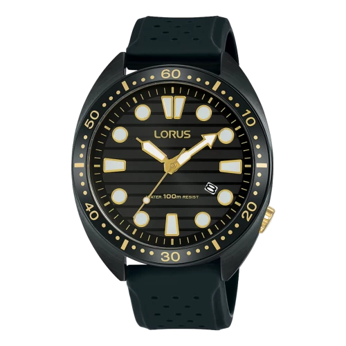 Reloj Lorus rh927lx9 para hombre colección Sports. Movimiento Japones from SEIKO. Con calibre pc32. Reloj Lorus caja de acero negro con bisel fijo en negro con contador de segundos en amarillo dorado y correa de silicona en negro. Corona cambio de hora en la posición de las cuatro. Esfera en negro, índices dorados con y agujas grandes con luminiscente, calendario en la posición de las cuatro. Cristal mineral. Fondo cerrado a rosca. WR 10 bar, resistente 100 metros. Diámetro de caja de 42 milímetros. Trae estuche y garantía oficial Lorus